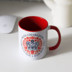 Our commemorative mug with classic red inner and handle design features the official emblem of King Charles’ Coronation.