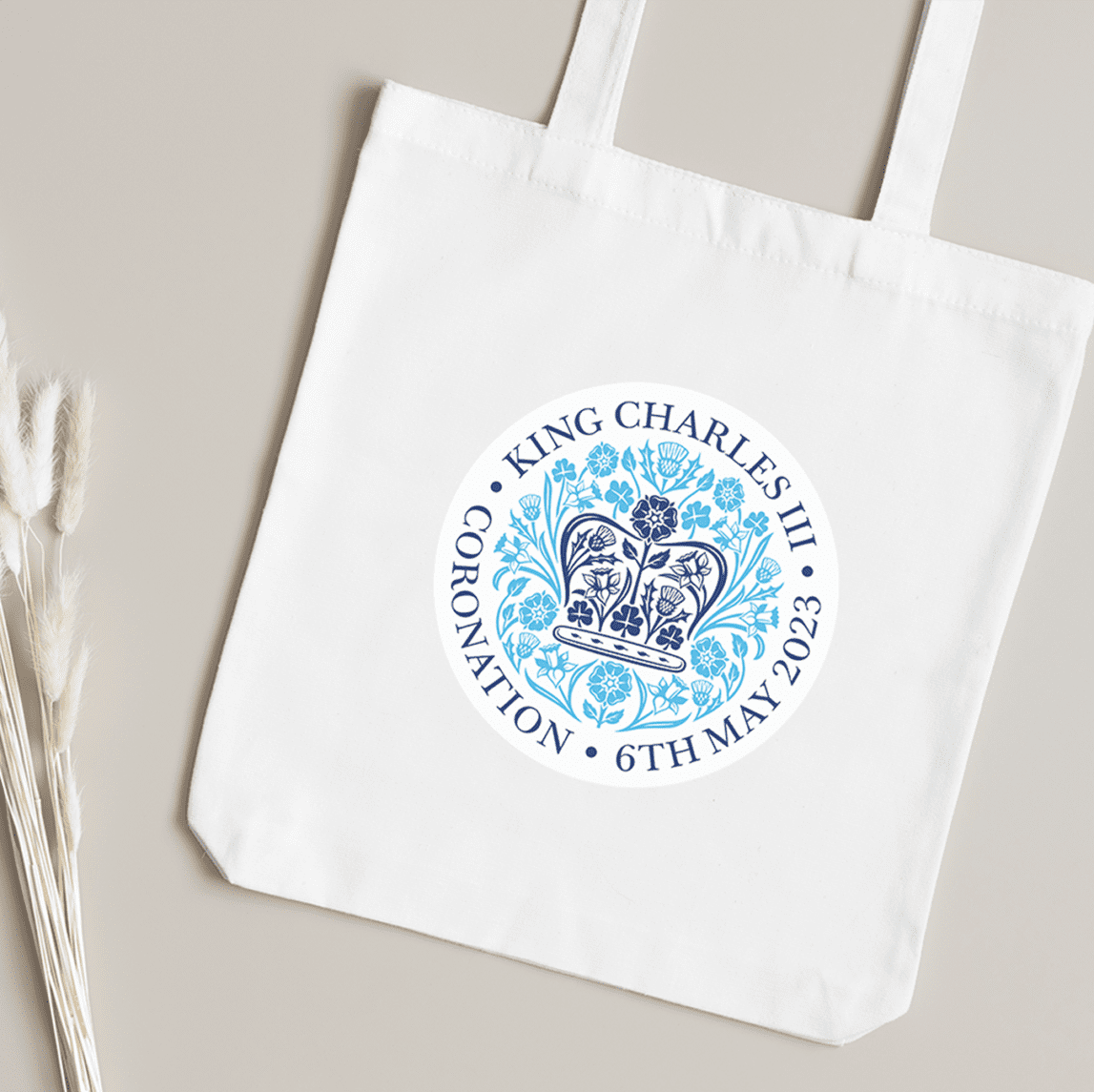 Our commemorative tote features emblem of King Charles’ Coronation with elegant blue design. The emblem honours the King’s love for natural world, depicting the flora of the four nations in the shape of St Edward’s Crown – the English Rose, Scottish Thistle, Irish Shamrock, and Welsh Daffodil.