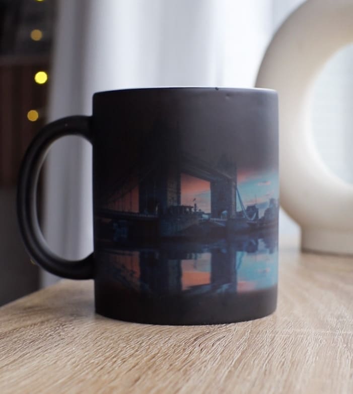 Add your own pictures and text to this magic, heat-changing 11oz ceramic mug. While it appears as a blank mug at first, when you add your hot drink, it slowly reveals your picture underneath!