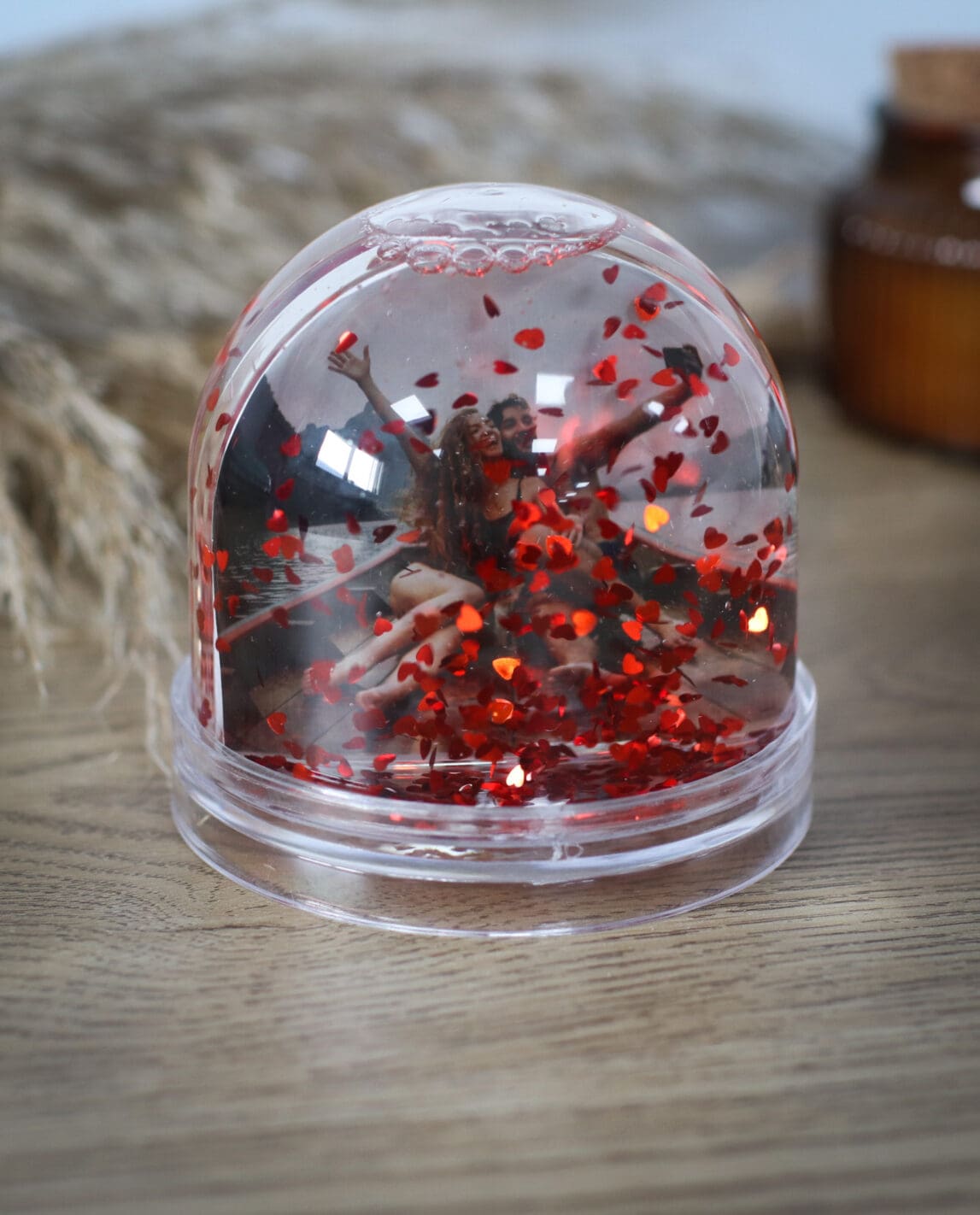 Add your image with our designer, and create a special Valentine’s Day glitter globe. This personalised snow globe is transparent, and the image sits in the middle, so you can see your favourite memories from either side.